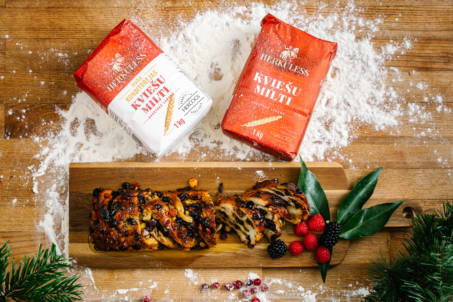 3. Sākot no garākās malas, mīklu sarullē rullī. Atkarībā no cepamās formas garuma, iespējams, ka rullis ir jāpārgriež uz pusēm.  Ar asu nazi gareniski visā garumā pārgriež vidū uz pusēm, iegūstot divas garas mīklas daļas. Tās pavērš ar pildījumu uz augšu un savij bizē (skatīt video).